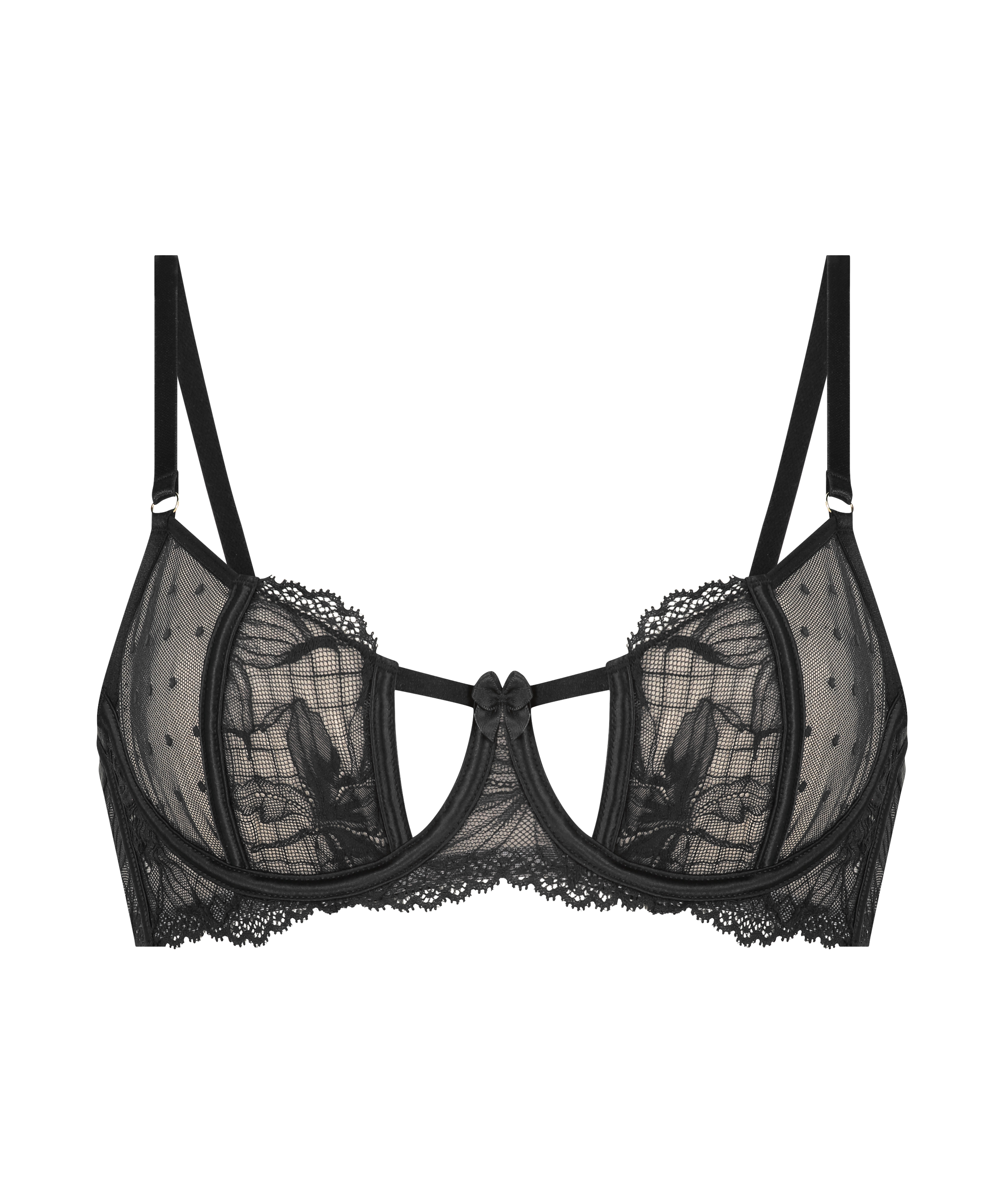 Føl deg sexy i denne behagelige og upolstrede BH-en!Den har utskårne detaljer og stroppedetaljer på koppene og ryggen. Med semi-transparent utseende, blonder og netting, og til slutt en søt sløyfe. Gjør settet komplett med matchende truse! En del av vår Private-kolleksjon.