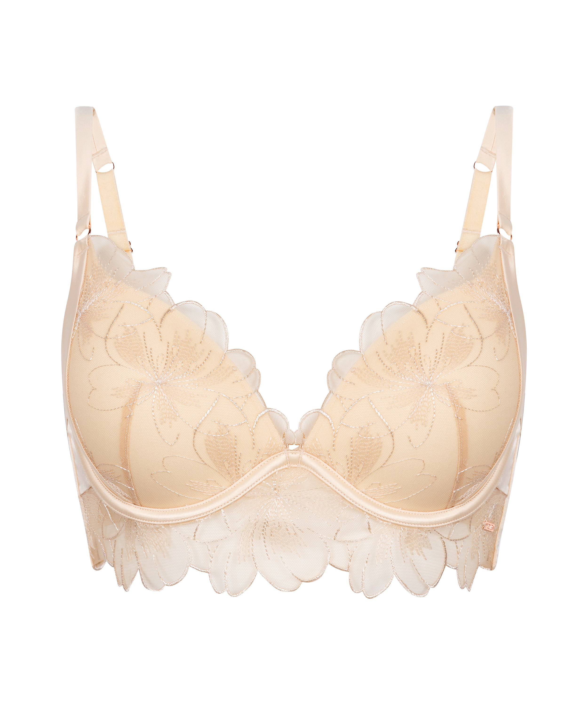 Løft undertøyskolleksjonen din med Emilia Padded Plunge Push-Up Longline BH! Den har delikate blomsterbroderier og et strukturert design, og har en skulpturell, flatterende passform. De polstrede skålene med bøyler og de justerbare stroppene sørger for støtte og komfort, perfekt for en look som utstråler selvtillit og sjarm!