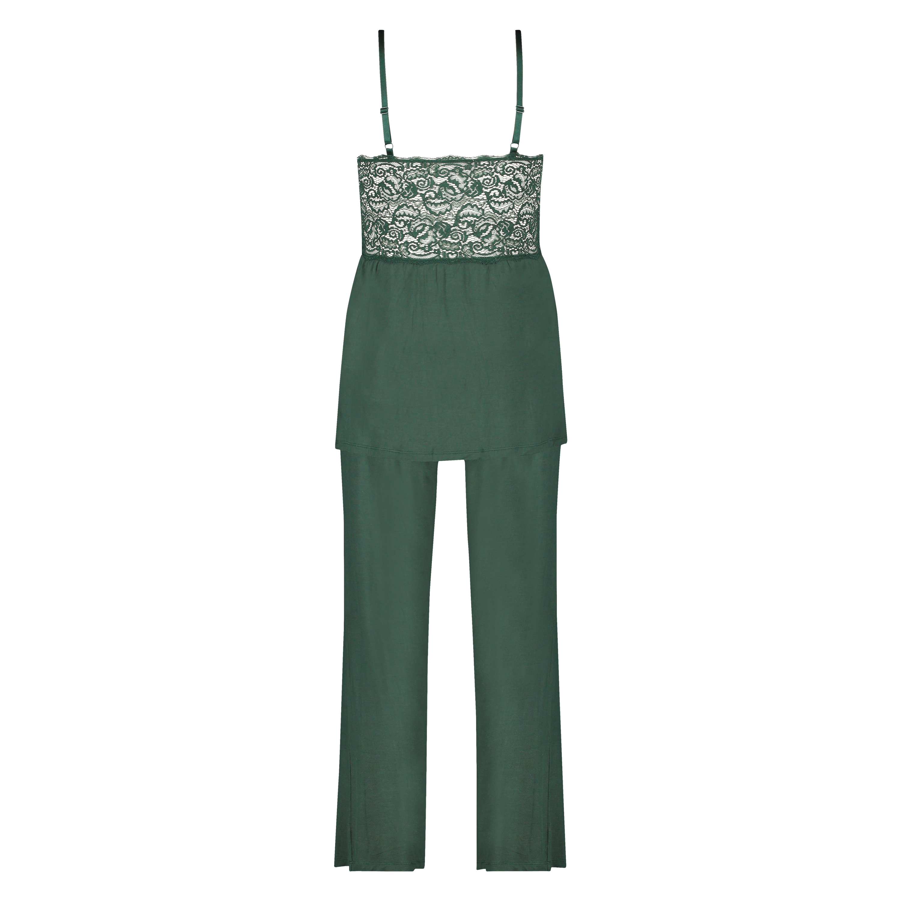 Denne pysjamasen er behagelig og er forseggjort med vakre blonder! Buksen og toppen er laget av jerseystoff slik at pysjamasen sitter behagelig og løst rundt kroppen din, og båndene er regulerbare.