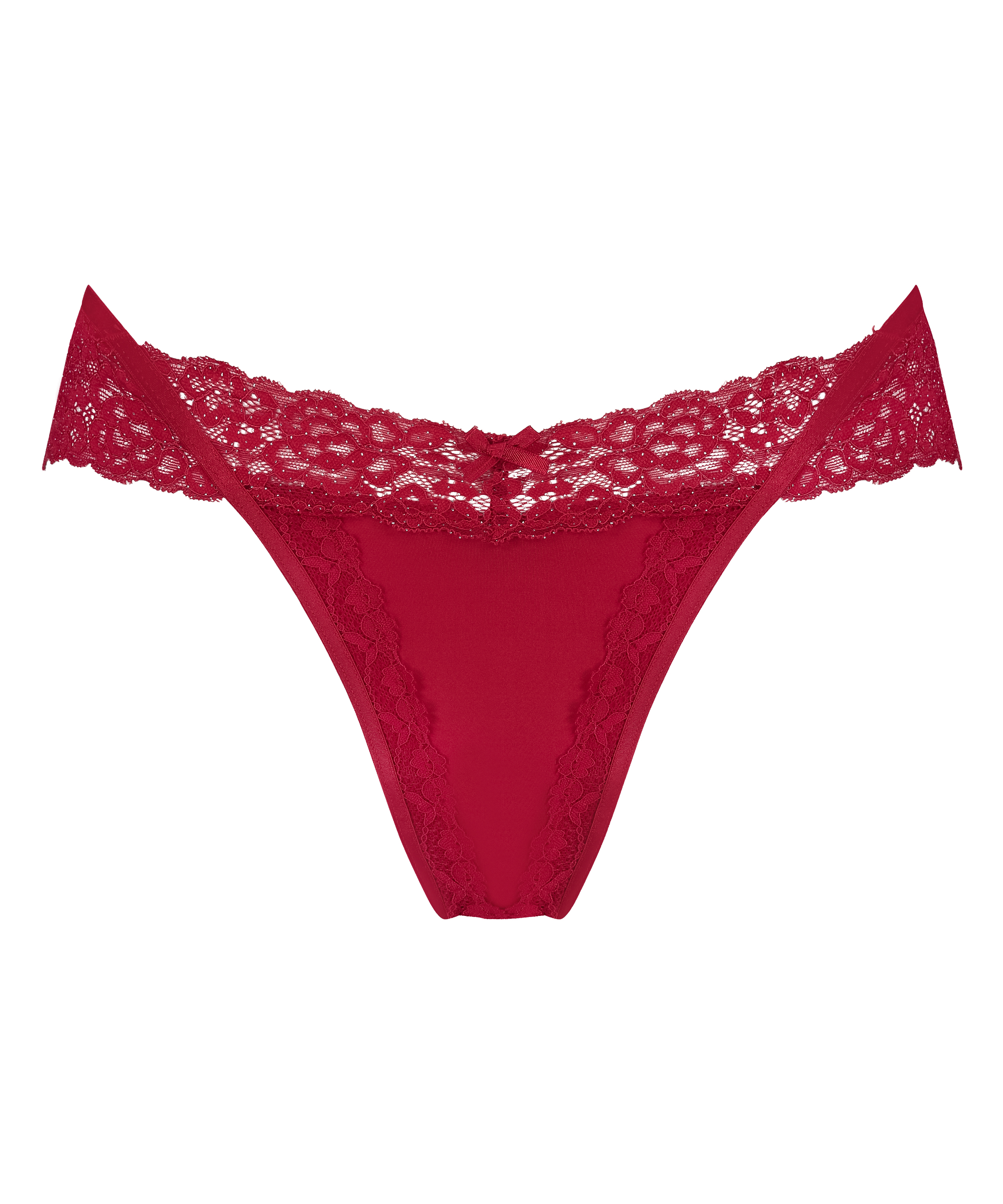 Blondene gjør denne lave tangaen sexy. Den har en sløyfe foran og et glitrende prikkemønster.