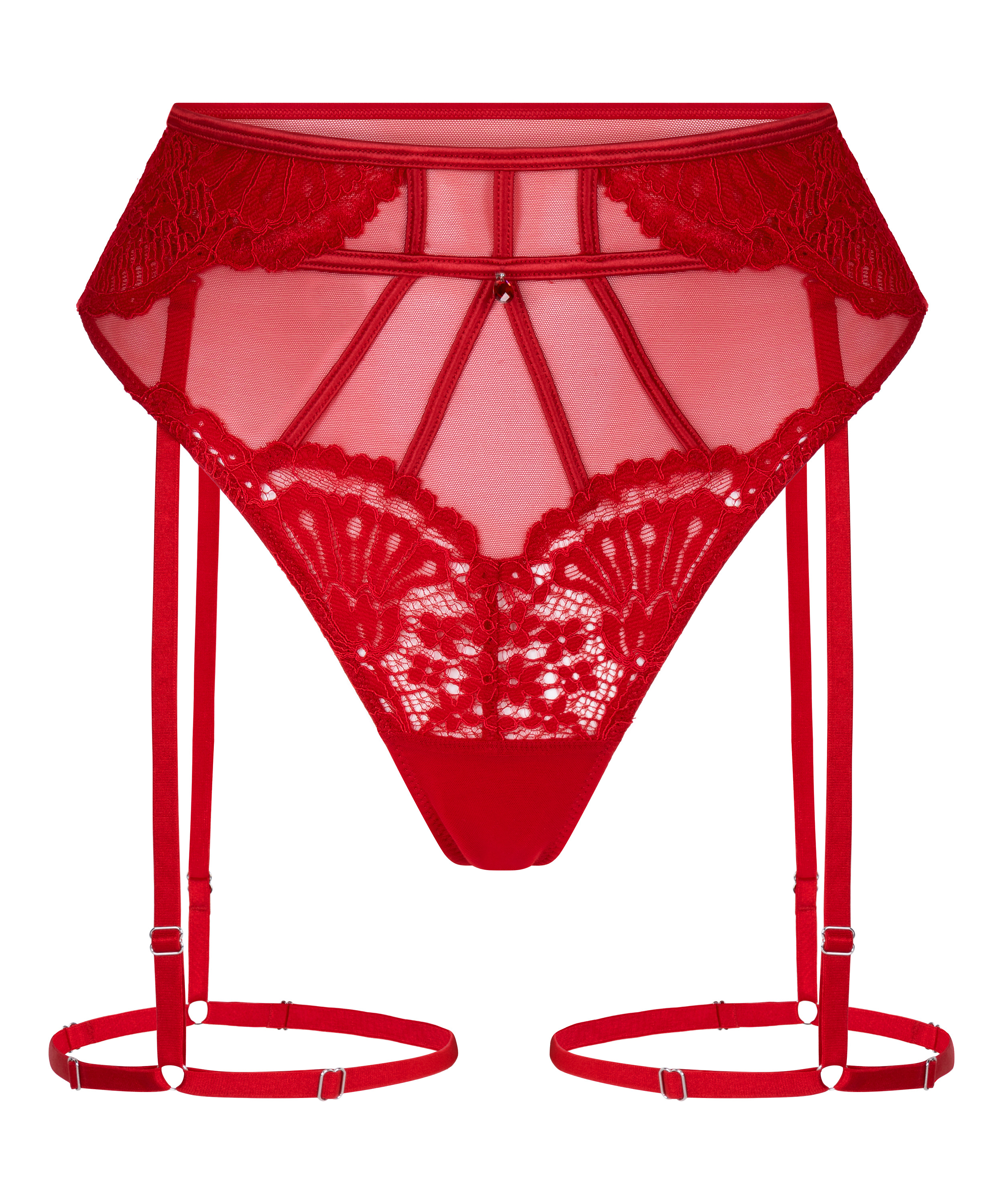Denne iøynefallende tangaen er designet for å imponere, og kombinerer delikate teksturer med detaljer. Laget av blonder og meshpaneler, gir den en forførende silhuett med et luksuriøst preg. En glitrende juvel i midten gir et glamorøst preg, mens avtakbare stropper gir deg frihet til å style den slik du ønsker. Kombiner med den matchende BH-en for en gjennomført look.
