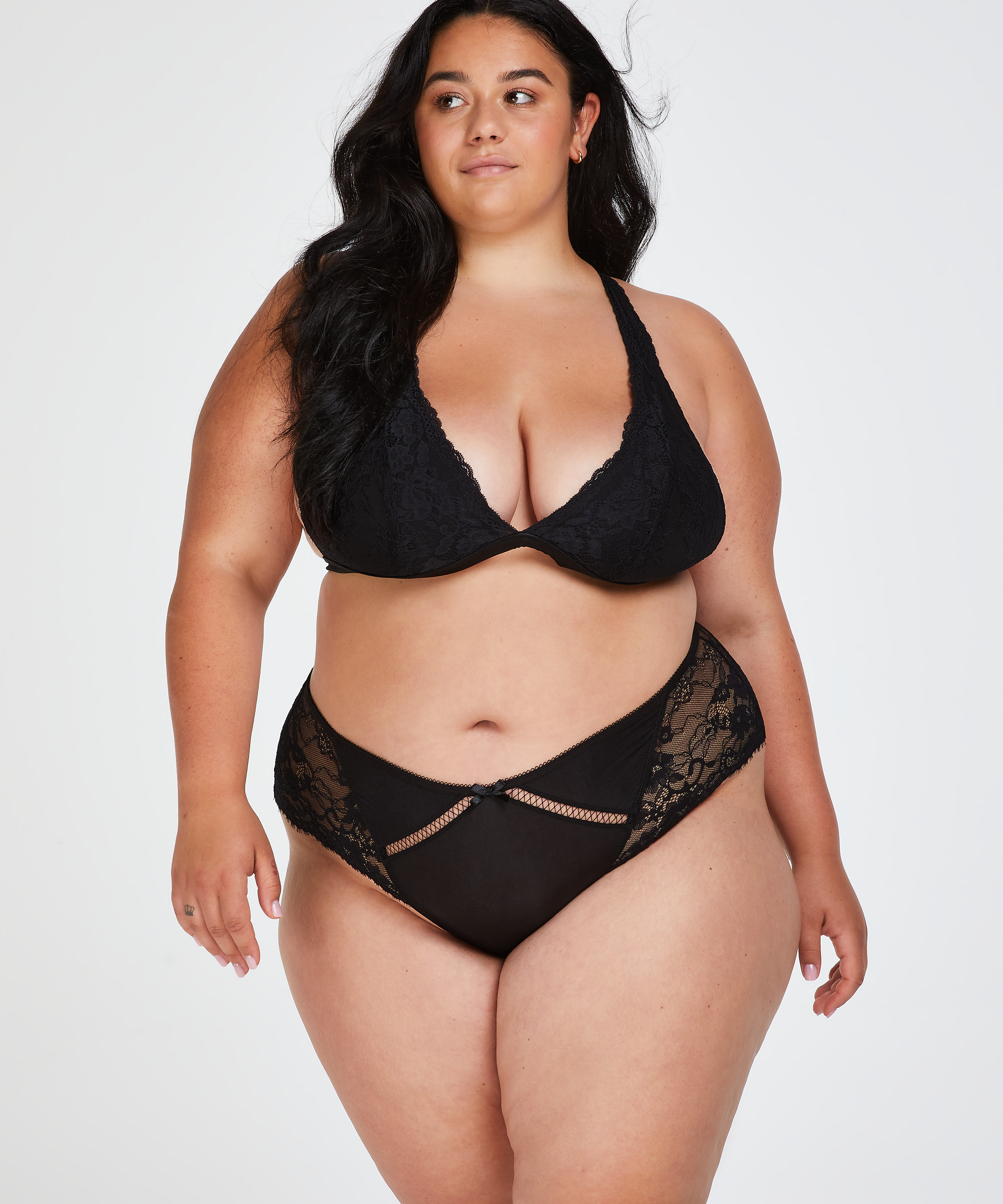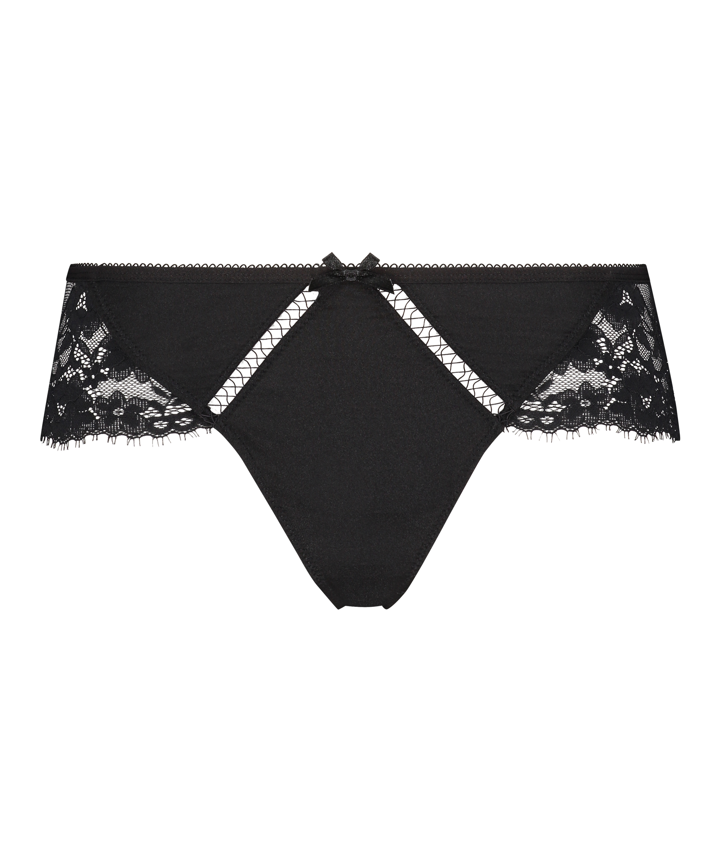 Hvor sexy er ikke denne hipster-stringen. Trusen har små cut-out-detaljer foran og masse blonder på sidene. Dessuten er det innvevd et skinnende mikrostoff. Kombiner med matchende BH og du har et vakkert sett.