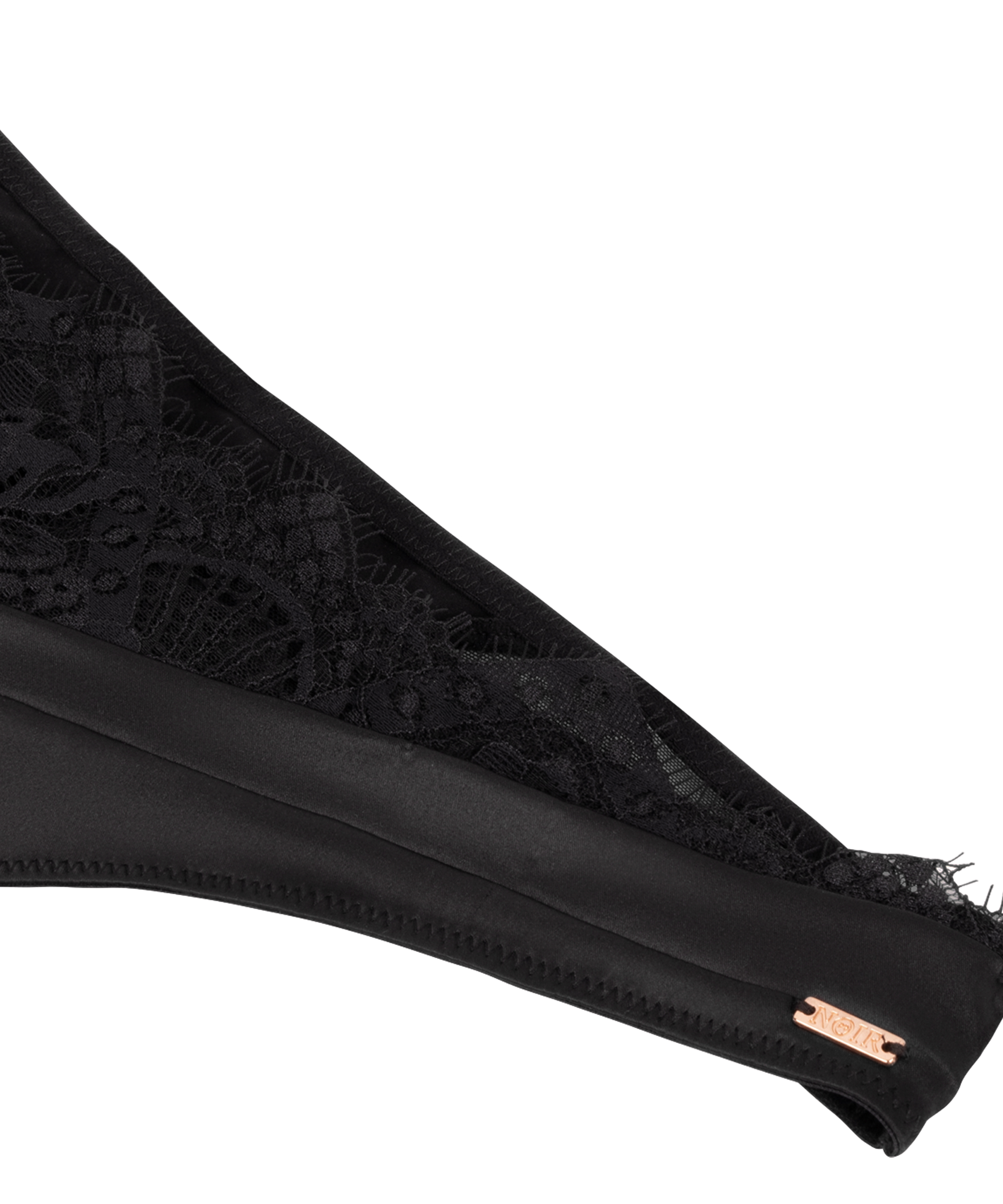 Gjør settet ditt komplett med denne nydelig pyntete thongen. Thongen har luksuriøse detaljer laget av blondestoff, sateng og mesh. Den avsluttes med en sløyfe. En del av Noir-kolleksjonen.